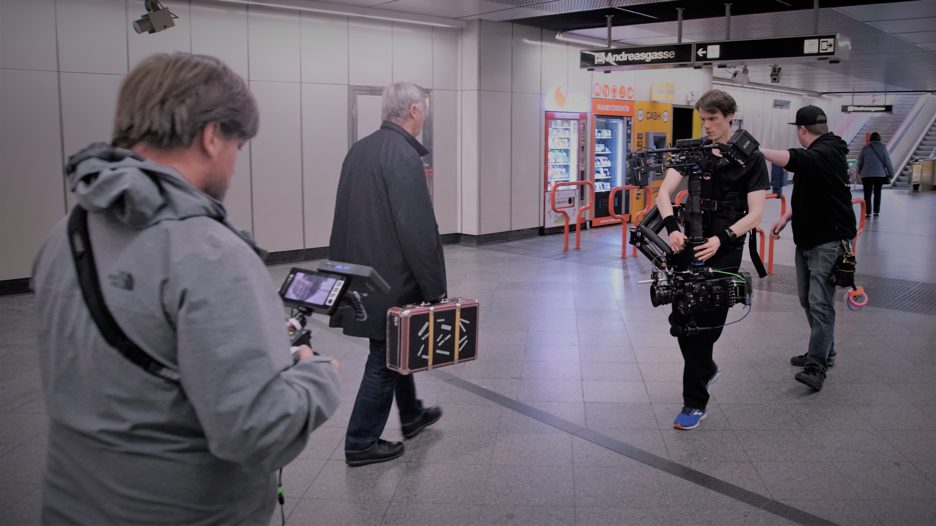 Mit einem gut eingespielten Team unter der Leitung von David Horswell (Regie) und dem effizienten Aufbau von Andreas Reischl (technische Leitung), blieb nach der Mittagspause noch genug Zeit sich ein spontanes Intro zu überlegen. So wurde am Nachmittag vor der Aufzeichnung unsere Varicam35 auf die Steadycam geschnallt und für einen gemütlichen Spaziergang durch die Ubahn Station „Neubaugasse“ und entlang der „Avenue Vassilakou“ (wie sie Andreas Vitasek gerne nennt) geführt.